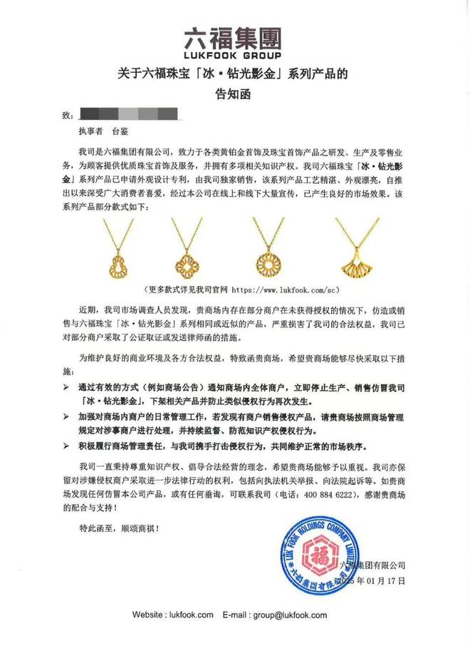 近日,六福集团向水贝多个商场发布告知函,提醒将可能对涉嫌侵犯其专利产品的商户采取进一步法律行动,并督促商场通知商户下架涉侵权产品。据悉,告知函中所提及的专利产品,为六福珠宝「冰·钻光影金」系列,产品通过炫彩工艺,打造出犹如带有钻石光芒的炫彩黄金。