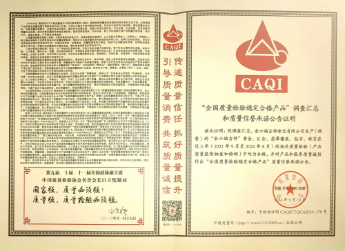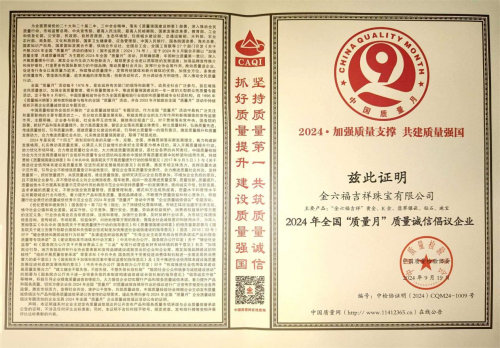 据悉,金六福吉祥珠宝作为珠宝行业标杆企业,同时也是中国质量检验协会会员单位,常年踊跃响应协会“质量月”活动,大力实施质量战略。2024年全国“质量月”期间,经由中国质量检验协会对金六福吉祥珠宝进行的强有力的检验调查,金六福吉祥珠宝荣获中国质量检验协会颁布的“全国质量检验稳定合格产品”荣誉,这已经是金六福吉祥珠宝第六年在此活动中获颁奖项。