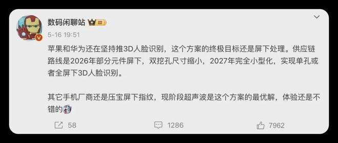 随后,供应链也将在 2027 年进一步提升工艺,保证 3D 人脸识别功能可在单挖孔或真全面屏下正常运行。