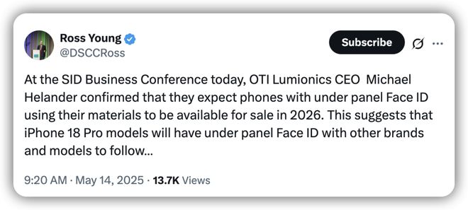 Ross Young 重申,需要注意的是,苹果最快将在明年发布首款采用屏下 Face ID 的 iPhone。