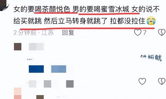 当时,女子看到茶颜悦色的店铺,想买一杯奶茶,但男子觉得价格太高,提议给她买蜜雪冰城的饮品。女子可能是出于赌气或情绪失控,便对男子说:“如果你不给我买,我就跳下去。”