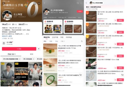 2019年左右,刘川东和王旌合伙成立了“云上珠宝”,并开始把大部分的经营放到了抖音上。理由非常简单,抖音电商深受年轻人喜爱,有庞大的消费群体,他看到了这背后的商业潜力;另外,平台成熟的推荐技术让消费者和心仪产品双向奔赴,短视频和直播的方式,让珠宝商能够更直观、立体地展示产品,如今,抖音的商城、搜索、店铺等货架场景也在拓展生意的空间。