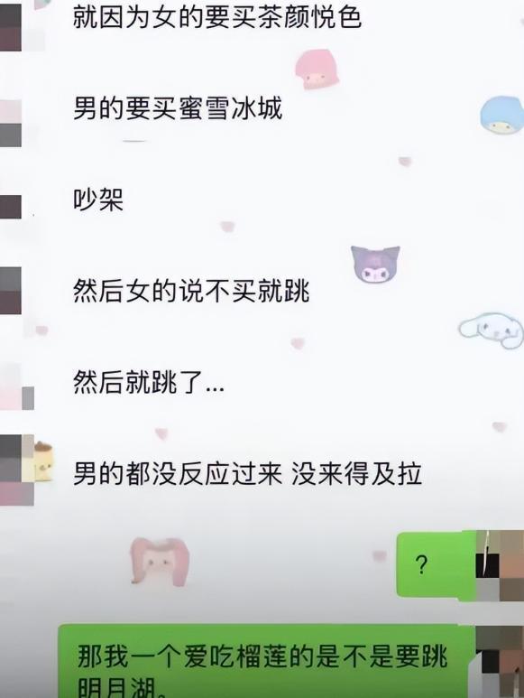 当时,女子看到茶颜悦色的店铺,想买一杯奶茶,但男子觉得价格太高,提议给她买蜜雪冰城的饮品。女子可能是出于赌气或情绪失控,便对男子说:“如果你不给我买,我就跳下去。”